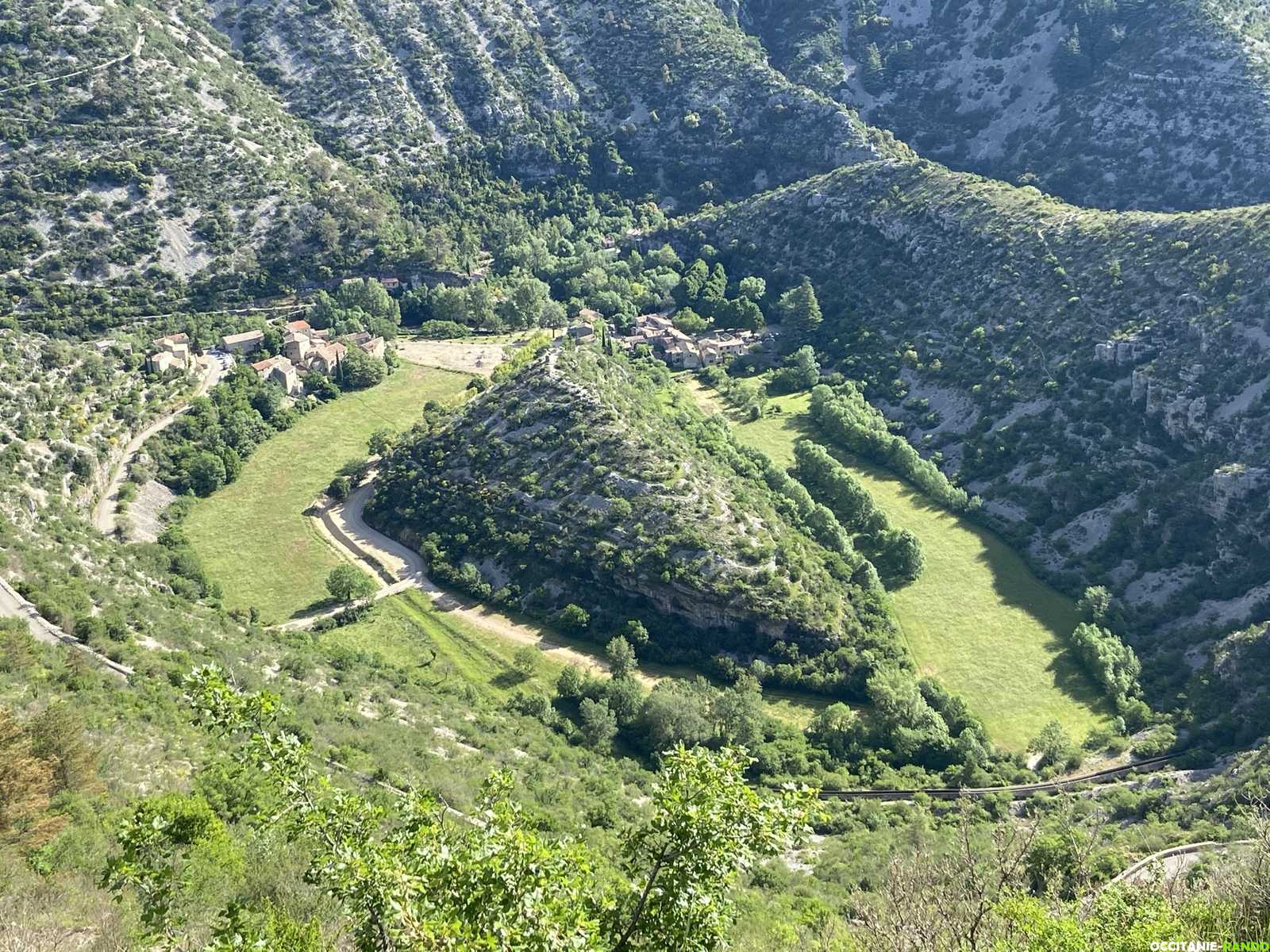 Au départ de la baume Auriol, le sentier du facteur descend en lacets le Cambon jusqu'à atteindre le village de Navacelles ou coule tranquillement la Vis.