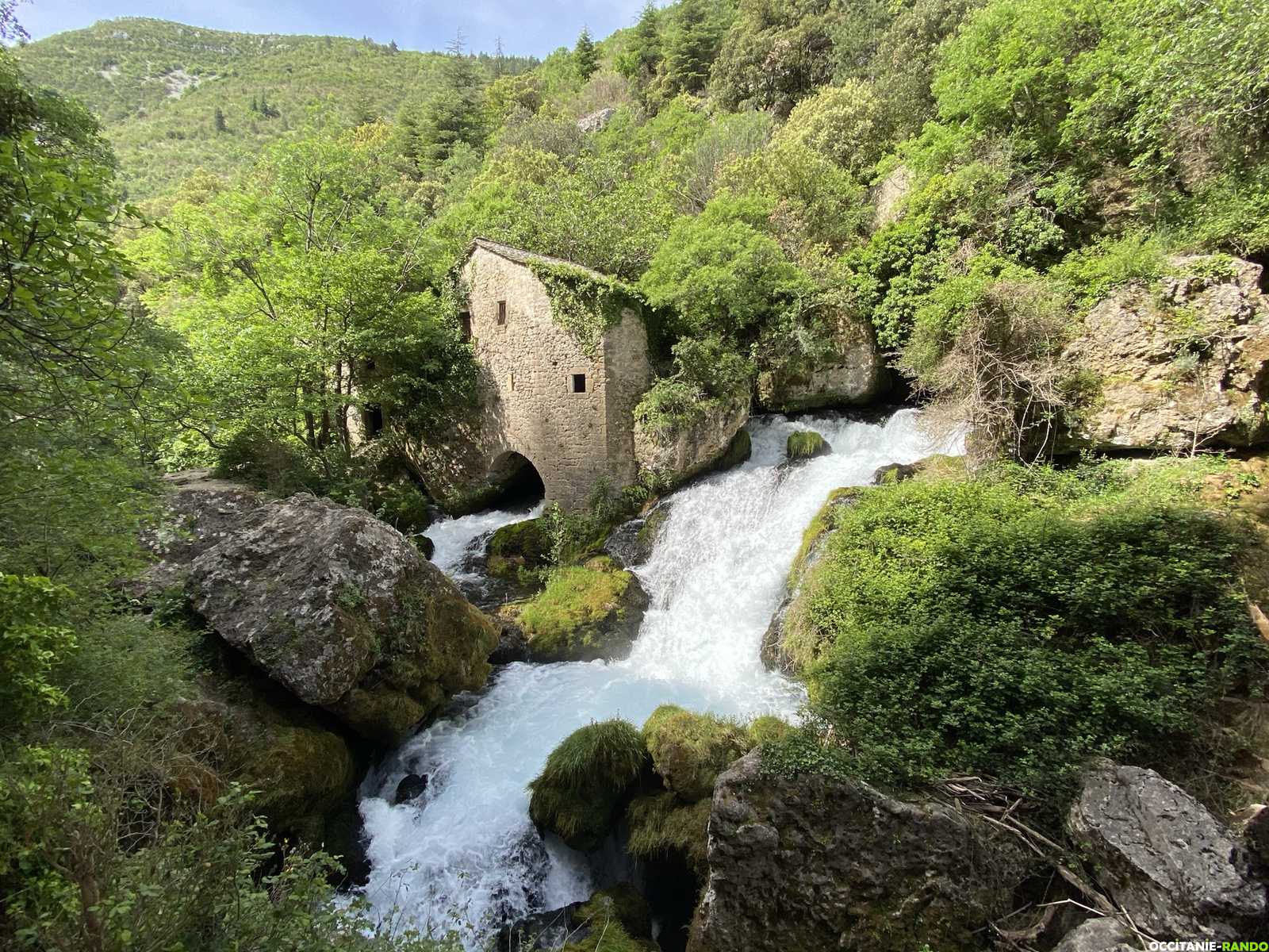 Pour éviter les fortes chaleurs, nous inversons le sens de la rando et démarrons par le sentier PR à flanc de colline pour rejoindre les moulins de la Foux là où la Vis resurgie de la montagne. Magnifique spectacle !
