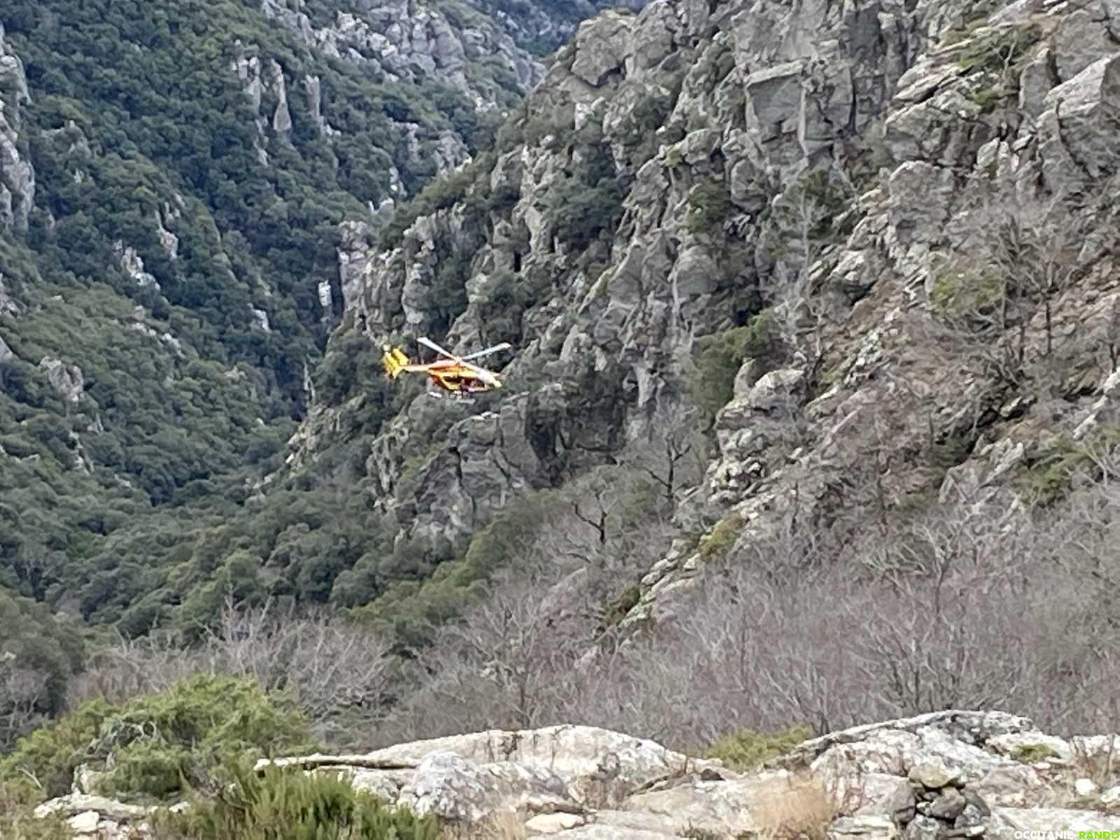 Sur le plateau, nous profitons de la vue offerte par les aiguilles du Rieutord et assistons malgré nous au sauvetage d'un randonneur perdu dans le Caroux par l'hélicoptère de la sécurité civile. Le bruit des pâles et l'hélitreuillage du randonneur, impressionnant !