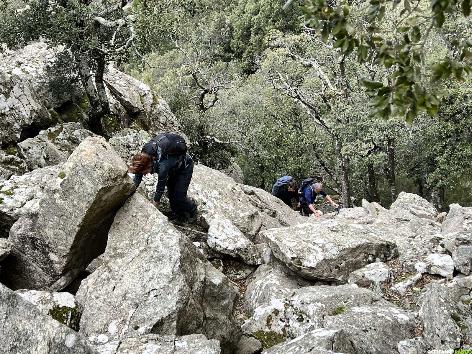 Nous passons le col de l'Ours et arrivons à un éboulis de roches qu'il faut escalader afin de poursuivre notre chemin jusqu'au Saut de l’Âne.