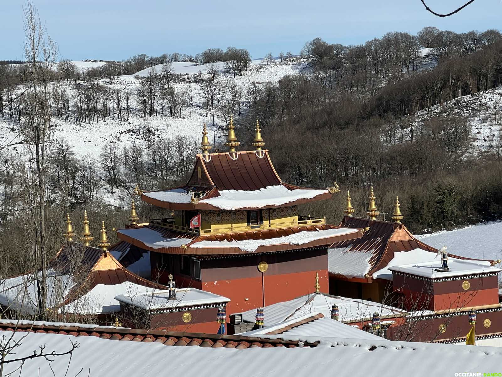 Le moment fort de la randonnée fut sans conteste l’arrivée au Temple bouddhiste Lérab Ling, dont l’architecture tibétaine se détachait magnifiquement sur le fond enneigé.