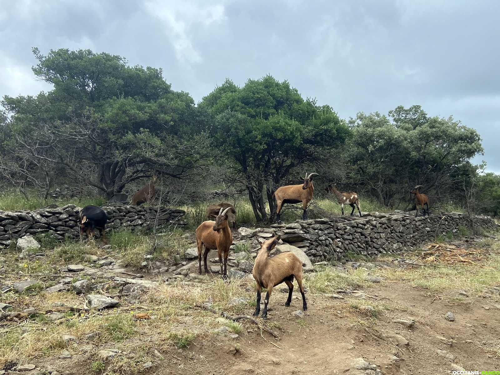 Petite rencontre bucolique avec quelques chèvres qui paissent tranquillement en prenant la pause avant de redescendre vers le hameau des Vailhés et ses maisons typiques de la région. Un havre de paix !