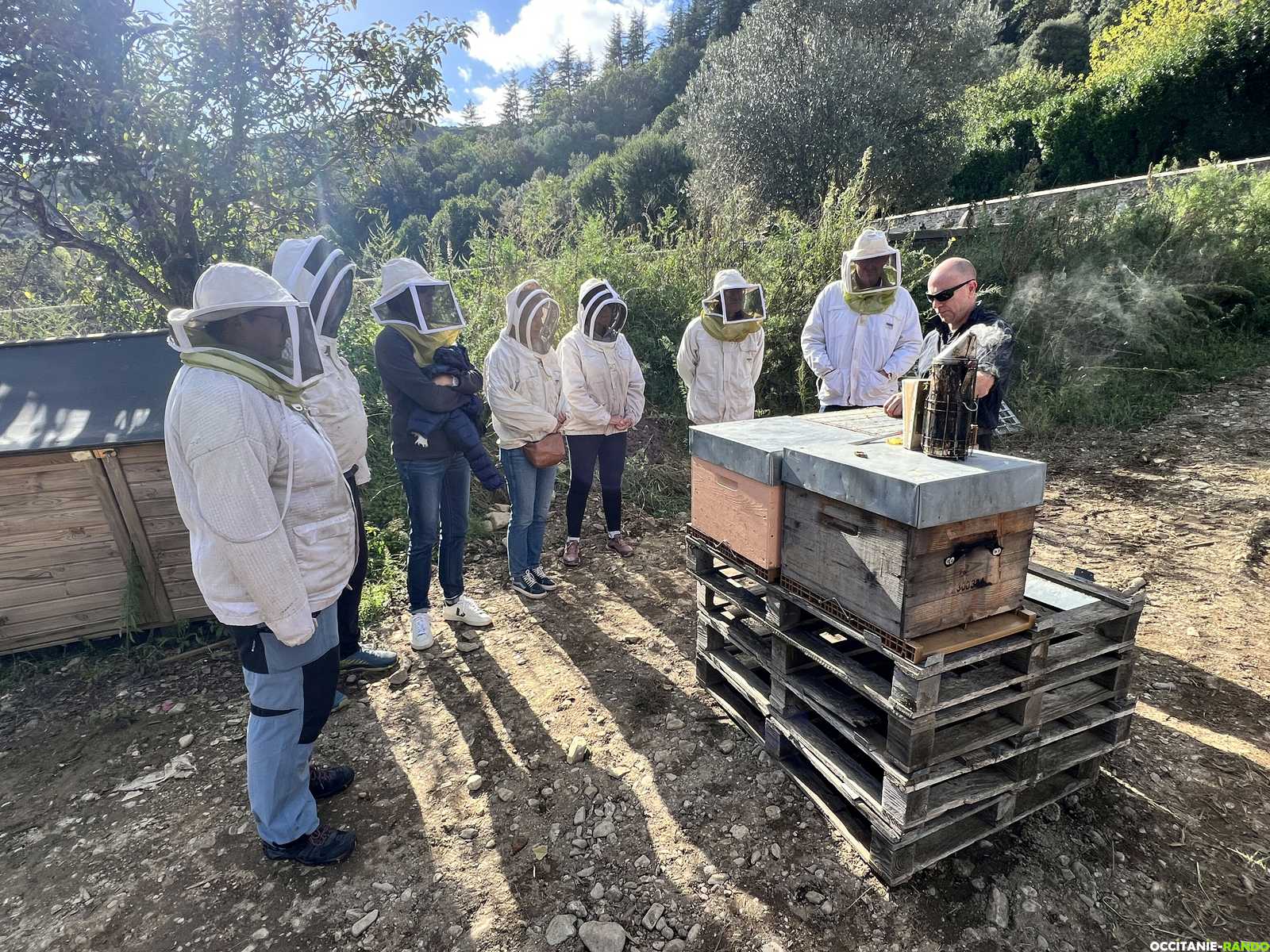 Une fois le déjeuner terminé, nous nous rendons à Saint-André-de Majencoules pour visiter les ruches et la miellerie d’Alexandra et Gilles – Miel Surfin.