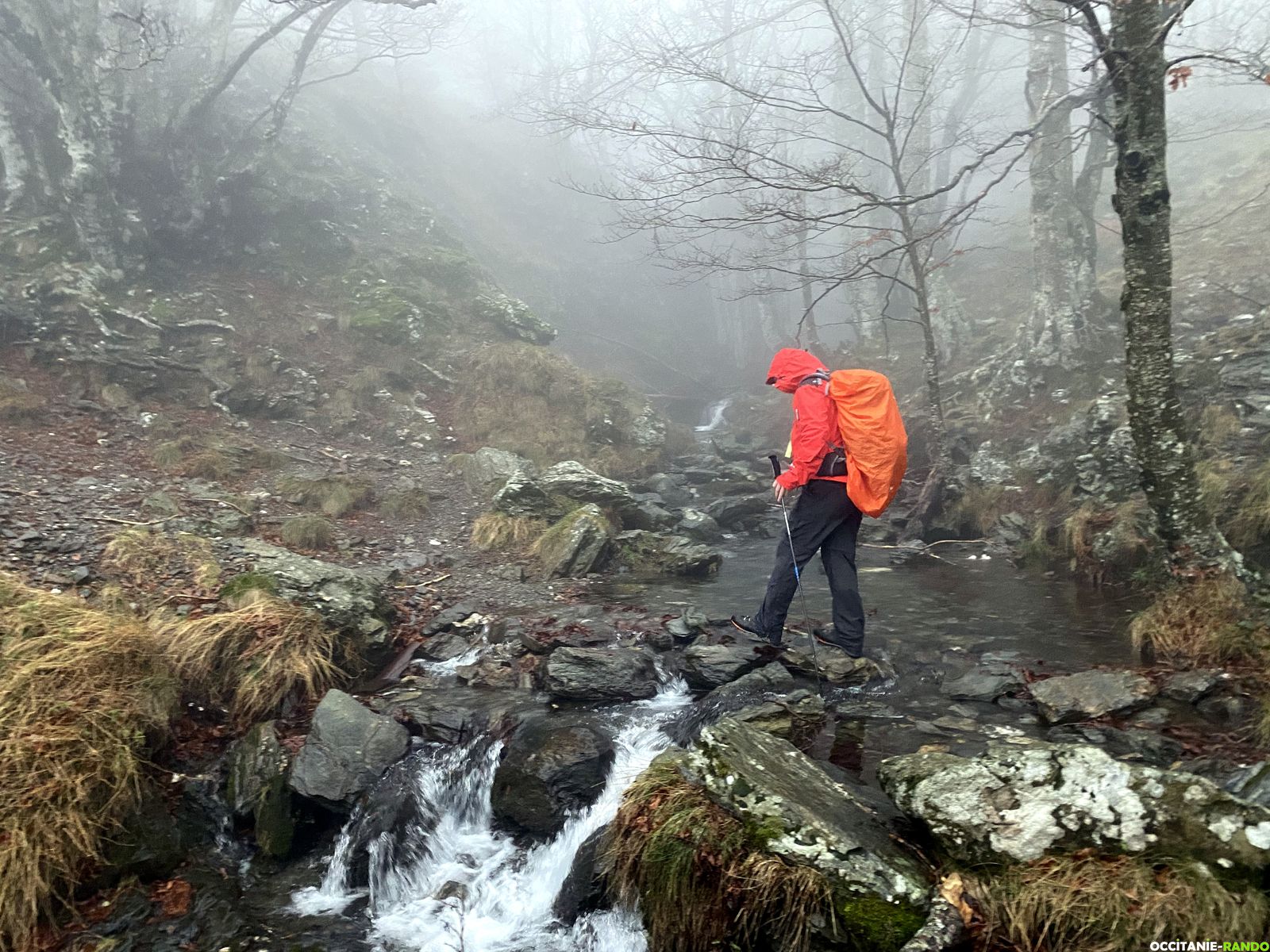 Le jour se lève enfin après une heure d’effort mais impossible de profiter du paysage tant le brouillard et la brume sont présents. Quelques passages à guet, quelques glissades sur les rochers bien humides n’entament pas notre détermination à terminer cette randonnée.