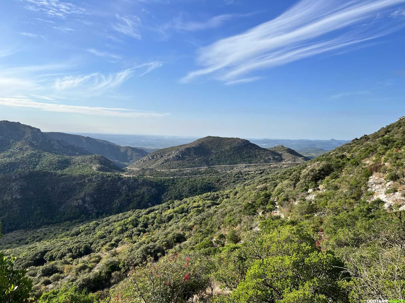De là haut, nous profitons de la vue sur toute la plaine viticole de l'Hérault jusqu'à la mer Méditerranée. Sète, le mont Saint-Clair, Agde et l'ancien volcan du mont Saint-Loup.