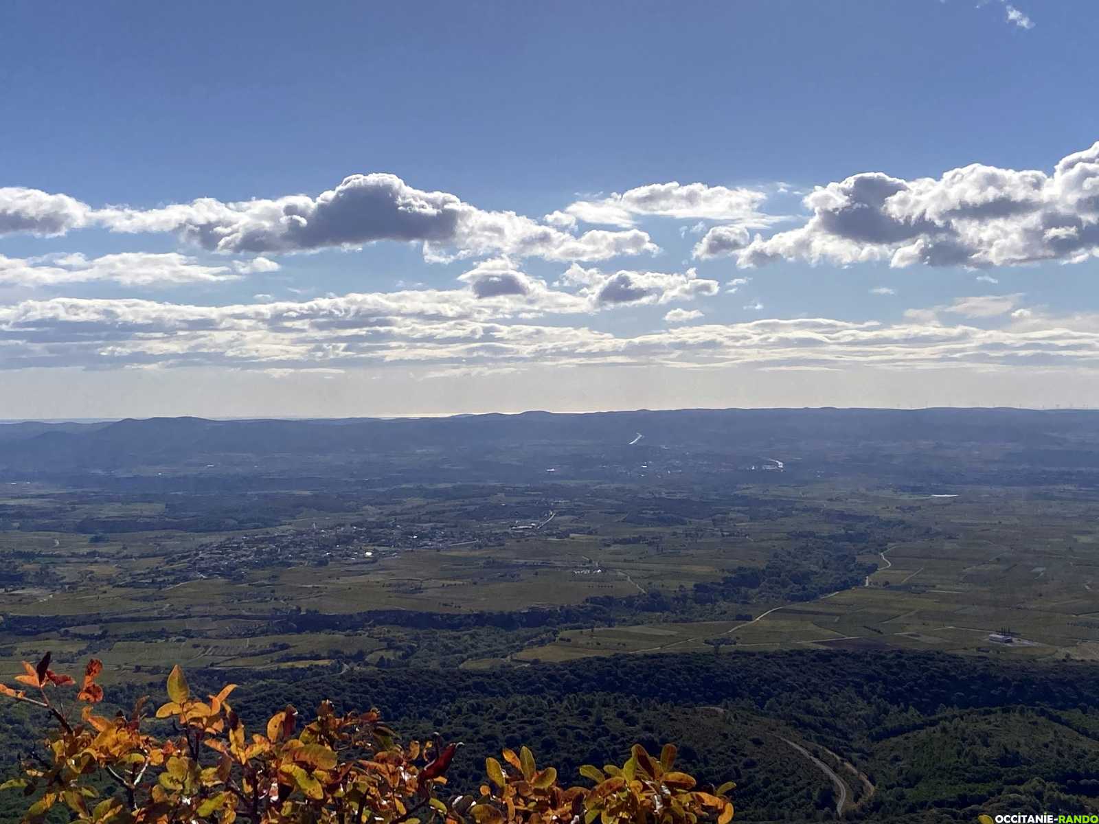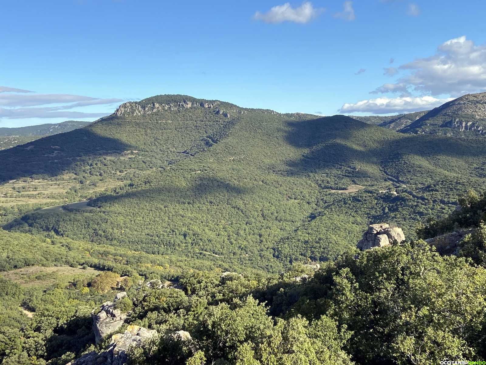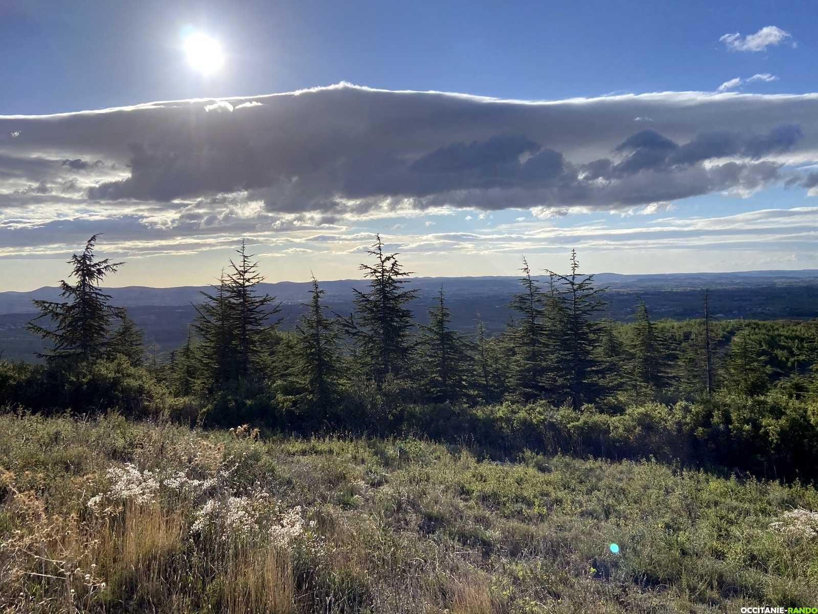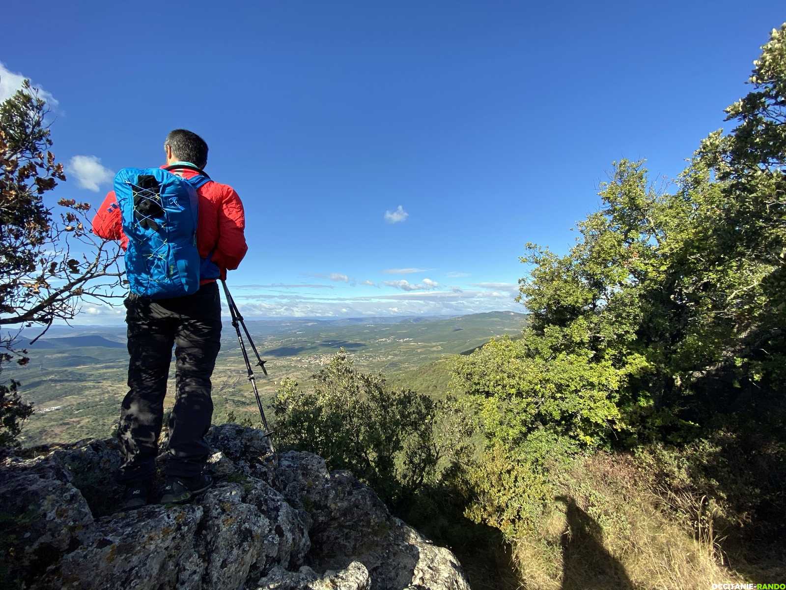 Arrivés au sommet, nous profitons d'une vue dégagée grâce au vent qui soufflait fort ce matin et nous contemplons le paysage qui s'étend sur toute la vallées de l’Hérault et de la Lergue, du Pic Saint-Loup aux Pyrénnées.