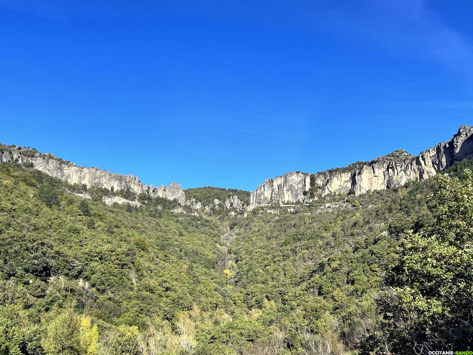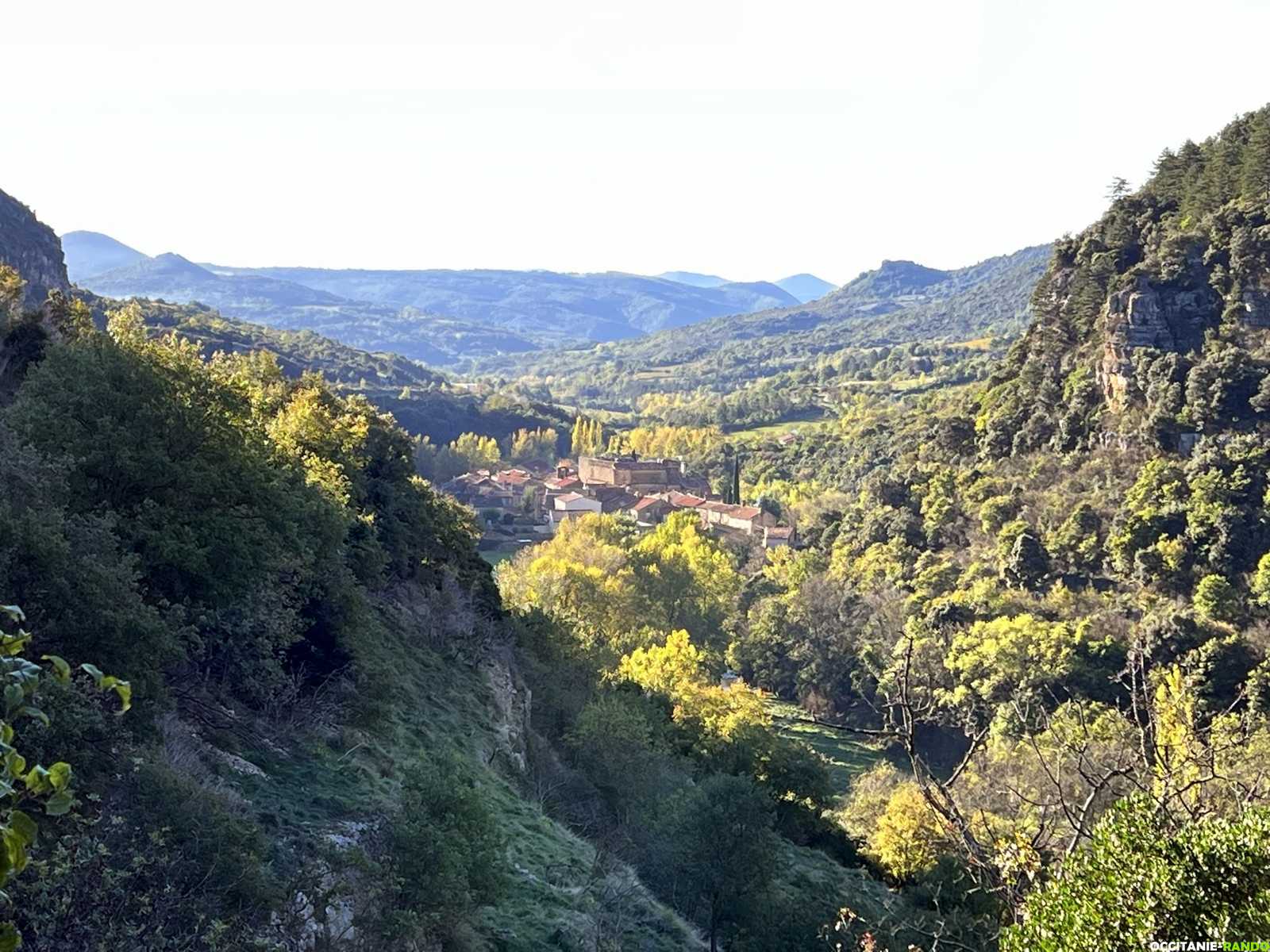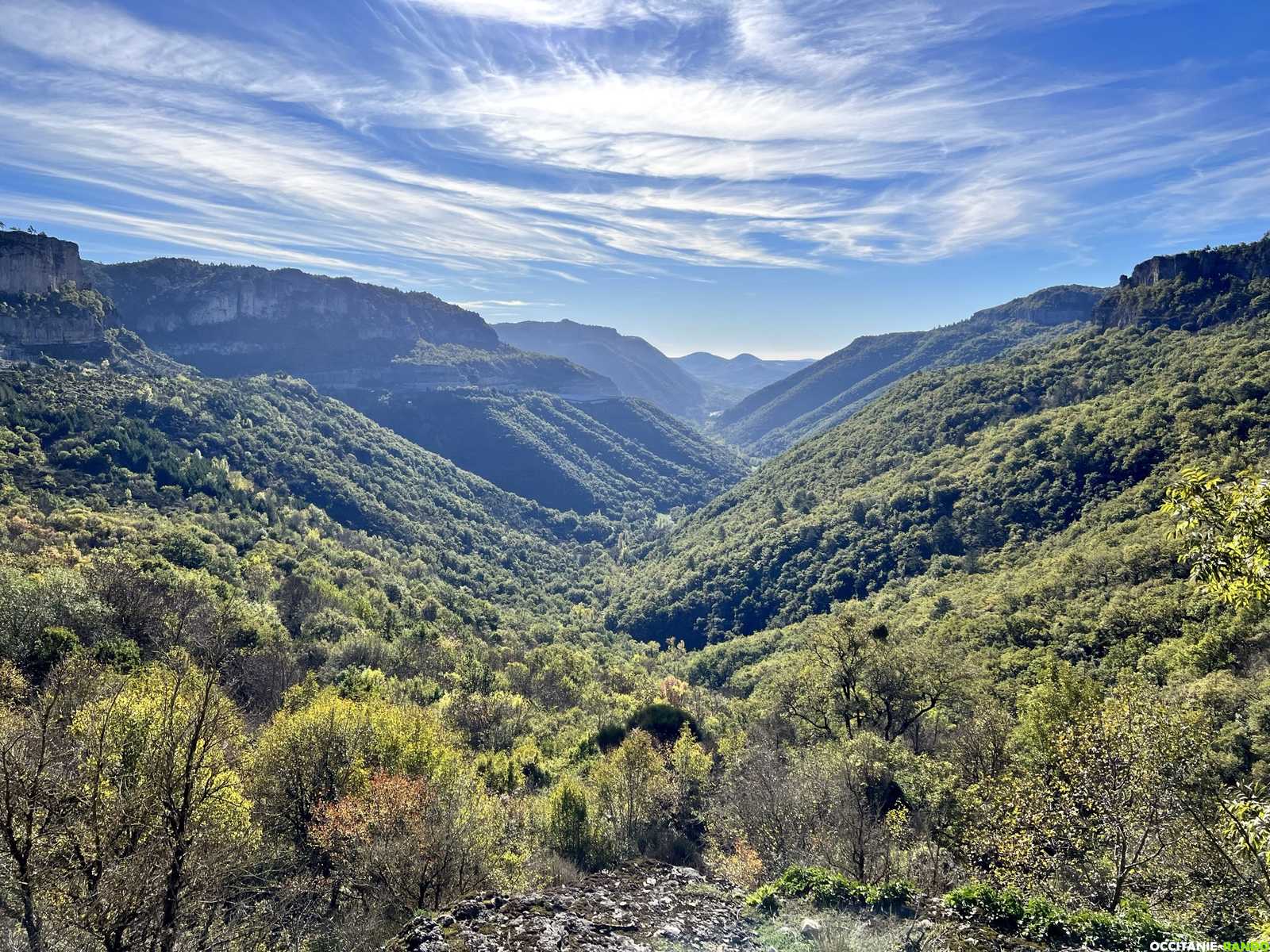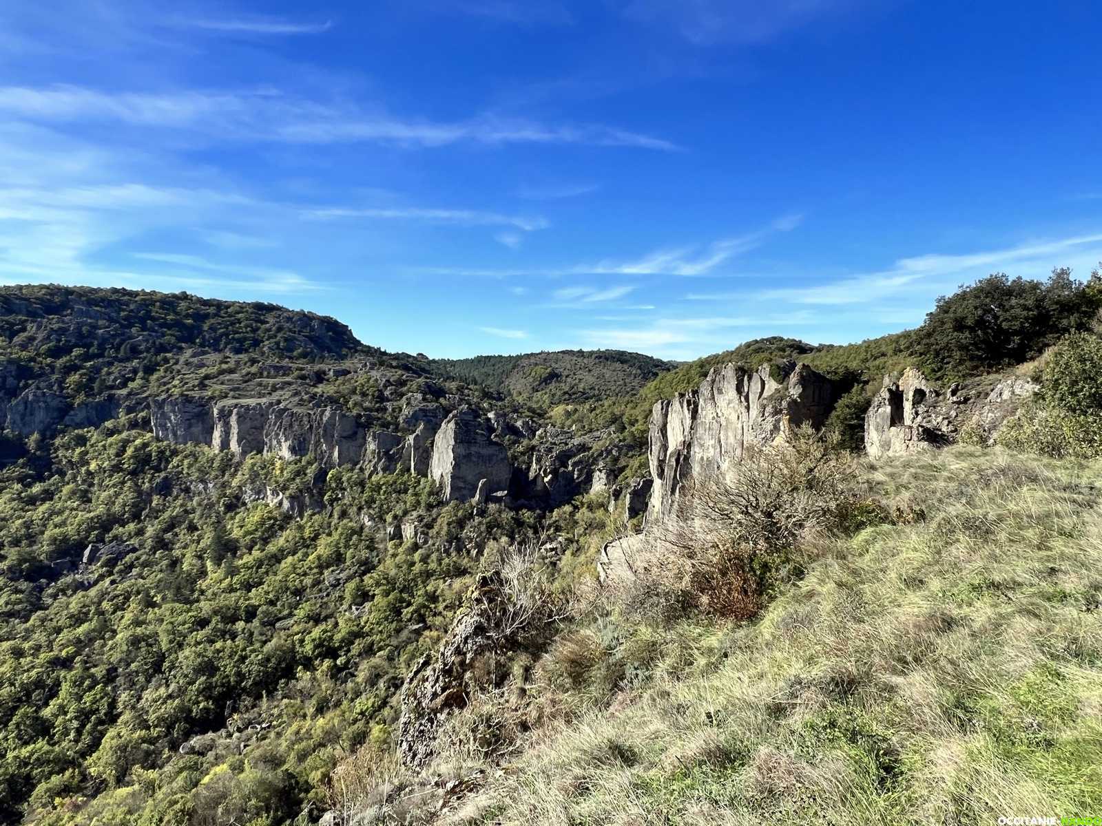 Nous empruntons la nouvelle portion du PR qui monte doucement vers le Pas de l'Escalette avec une vue imprenable sur les contreforts du Larzac.