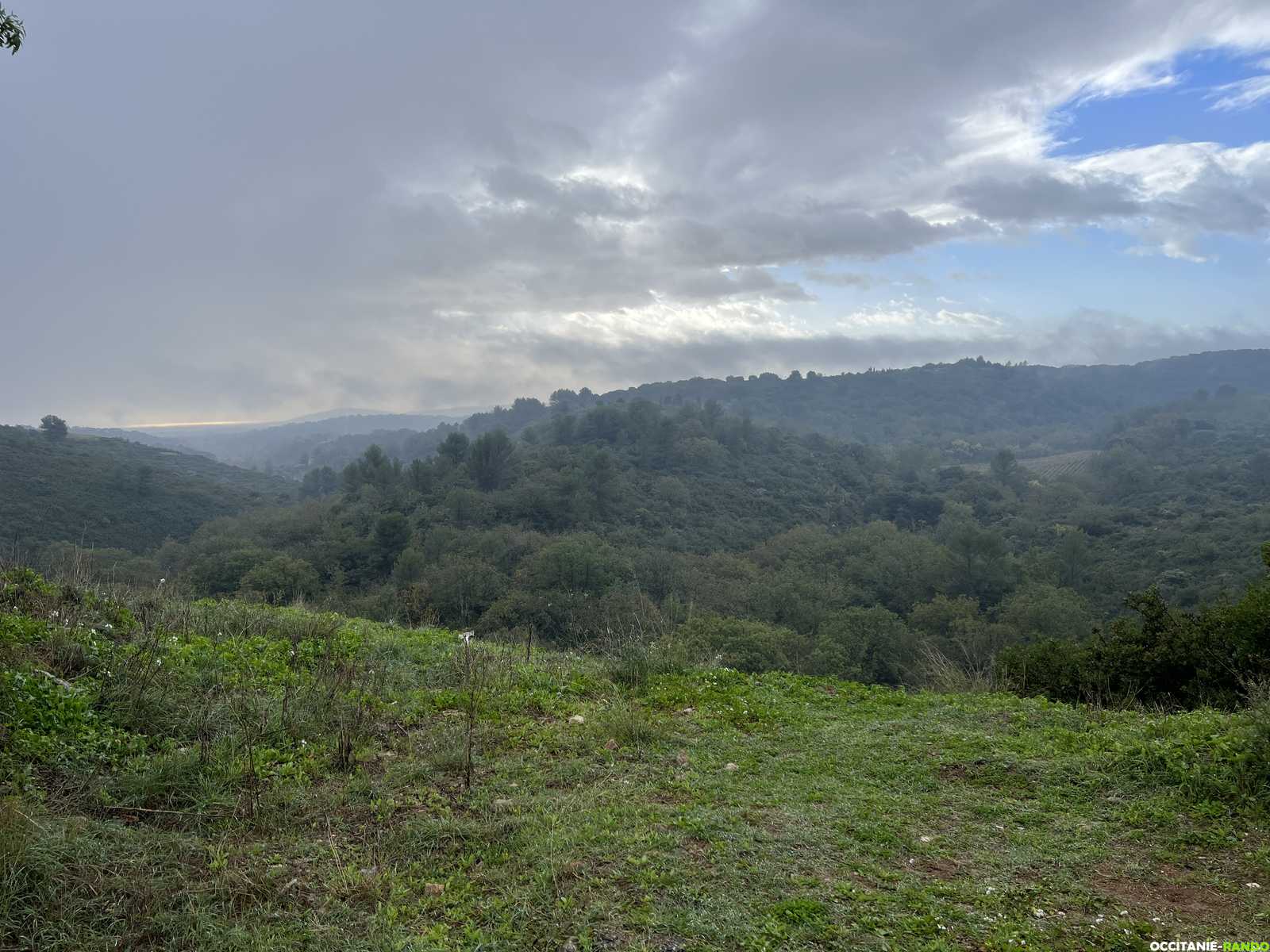 Nous commençons donc notre randonnée avec une belle petite côte qui nous amène sur les hauteurs, en plein cœur des garrigues, accompagnés d’un temps assez incertain.