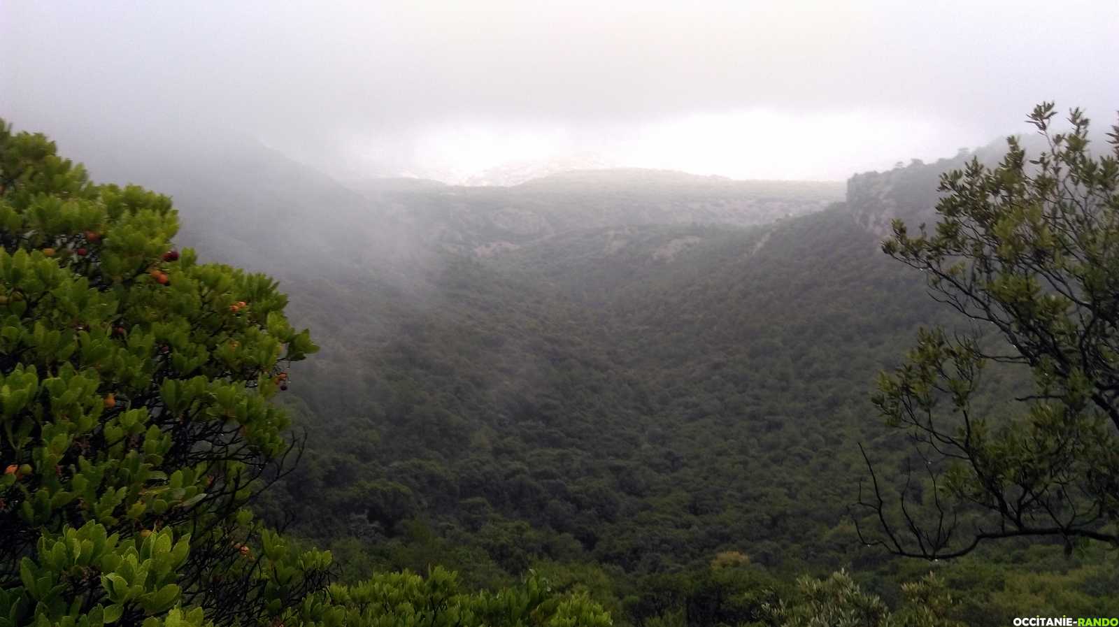 Les arbustes et les branches déposent au passage la rosée du matin qui peu à peu, imbibe nos vêtements et le sac à dos. Heureusement que les températures sont assez douces pour la saison. Nous poursuivons ensuite par une longue partie en sous-bois dans un brouillard assez dense. De nombreux arbousiers nous proposent leurs fruits tout au long du chemin. Les arbouses sont à point et vraiment délicieuses.