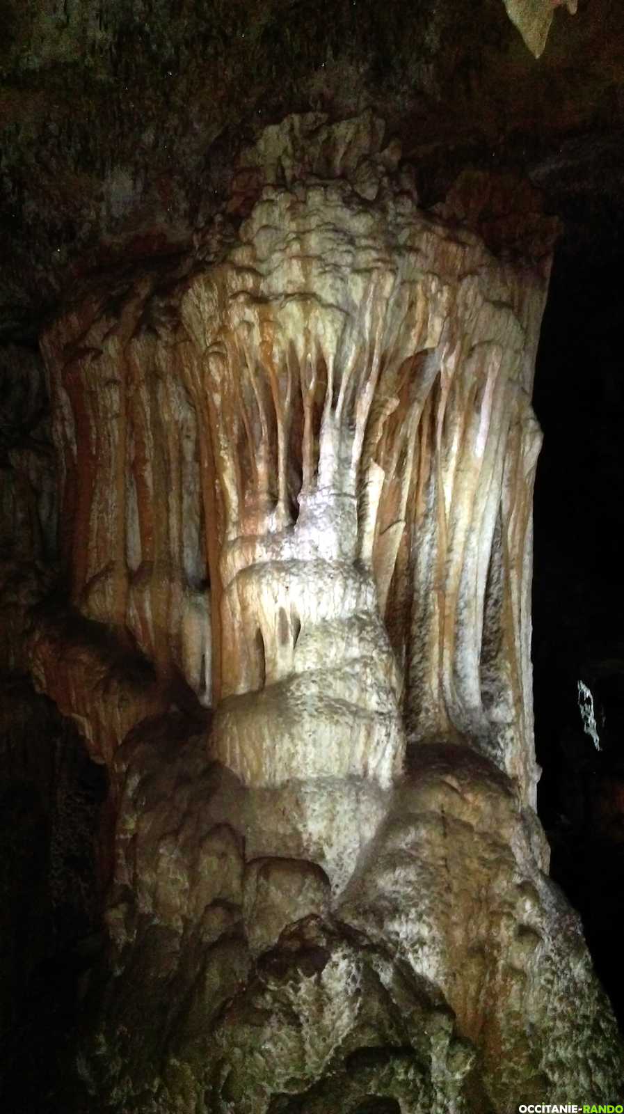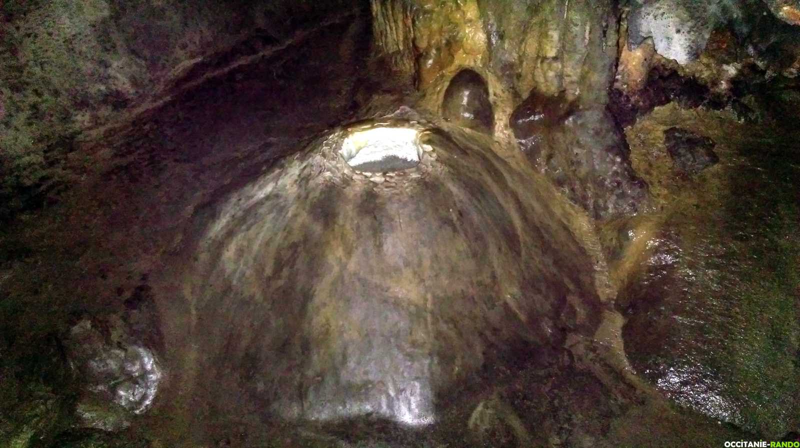 Après avoir visité la salle principal d'environ 12 m, nous nous sommes engagés dans un rétrécissement de la galerie, via une petite pente qui conduit dans une salle concrétionnée, ornementée par un réceptacle stalagmitique (sorte de gour) en forme de bénitier.