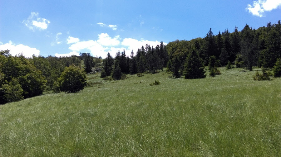 Depuis l'Espérou, nous traversons tout d'abord la forêt domaniale de l'Aigoual où nous passons pas très loin du col du Minier ou nous retrouvons le lac des Pises à partir du col des Portes (attention, la carte IGN du GR66 n'est pas à jour).